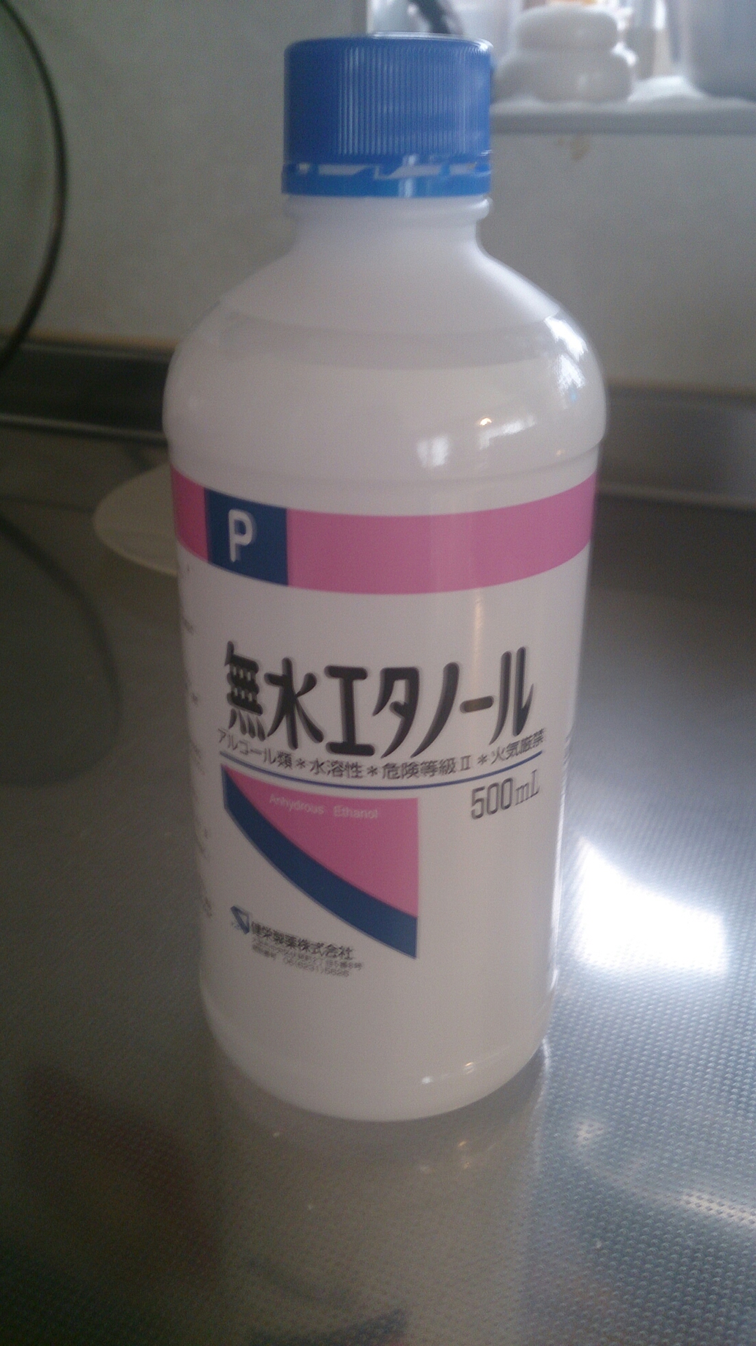 消毒用のエタノール80%程度のものはイソプロパノールという飲めないもの(毒かは不明だが多分毒)が入っていることがあるのでオススメしません。買わないでください。コスパ悪いし。私が買ったものは99.5%の無水エタノールです